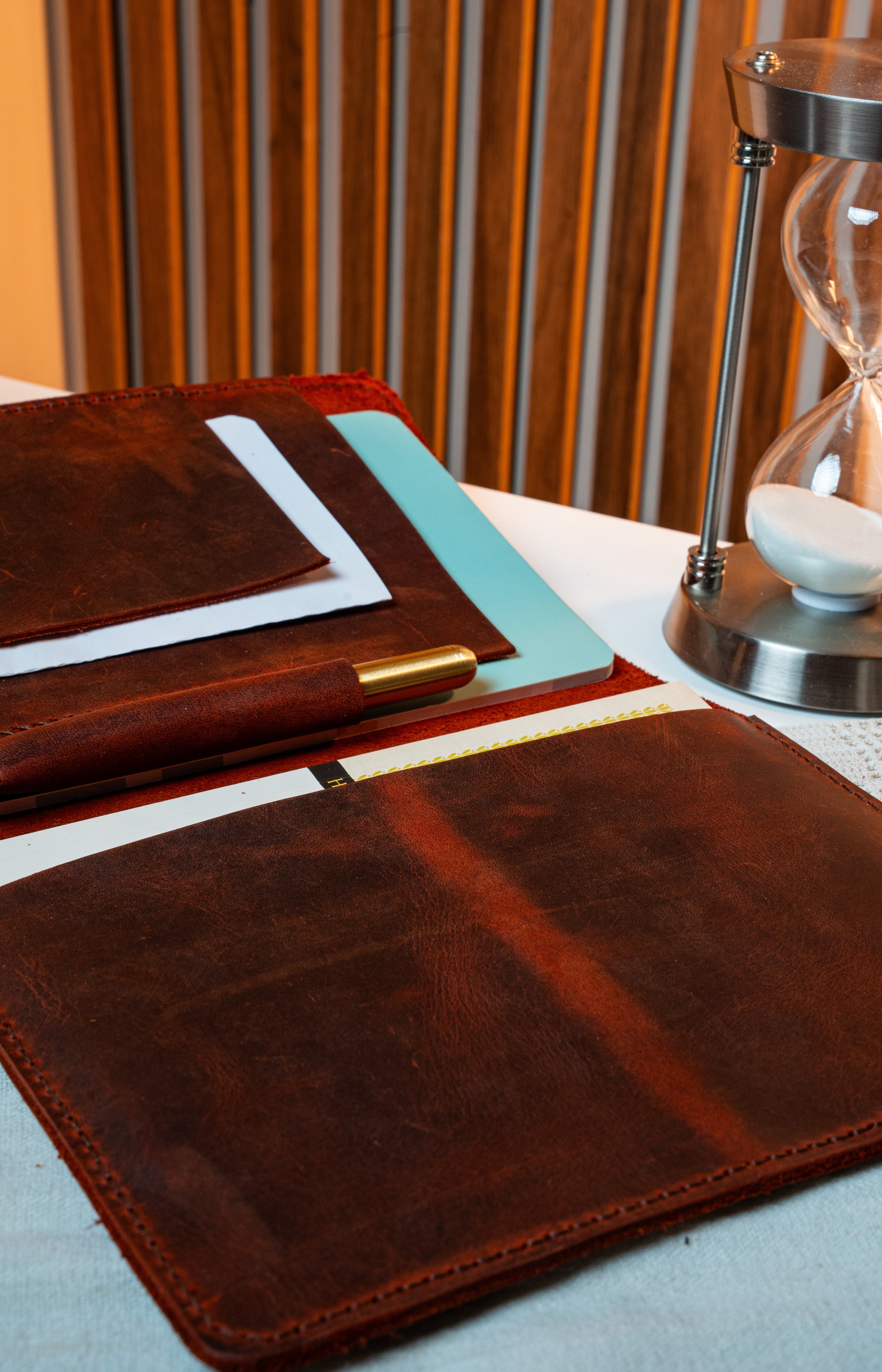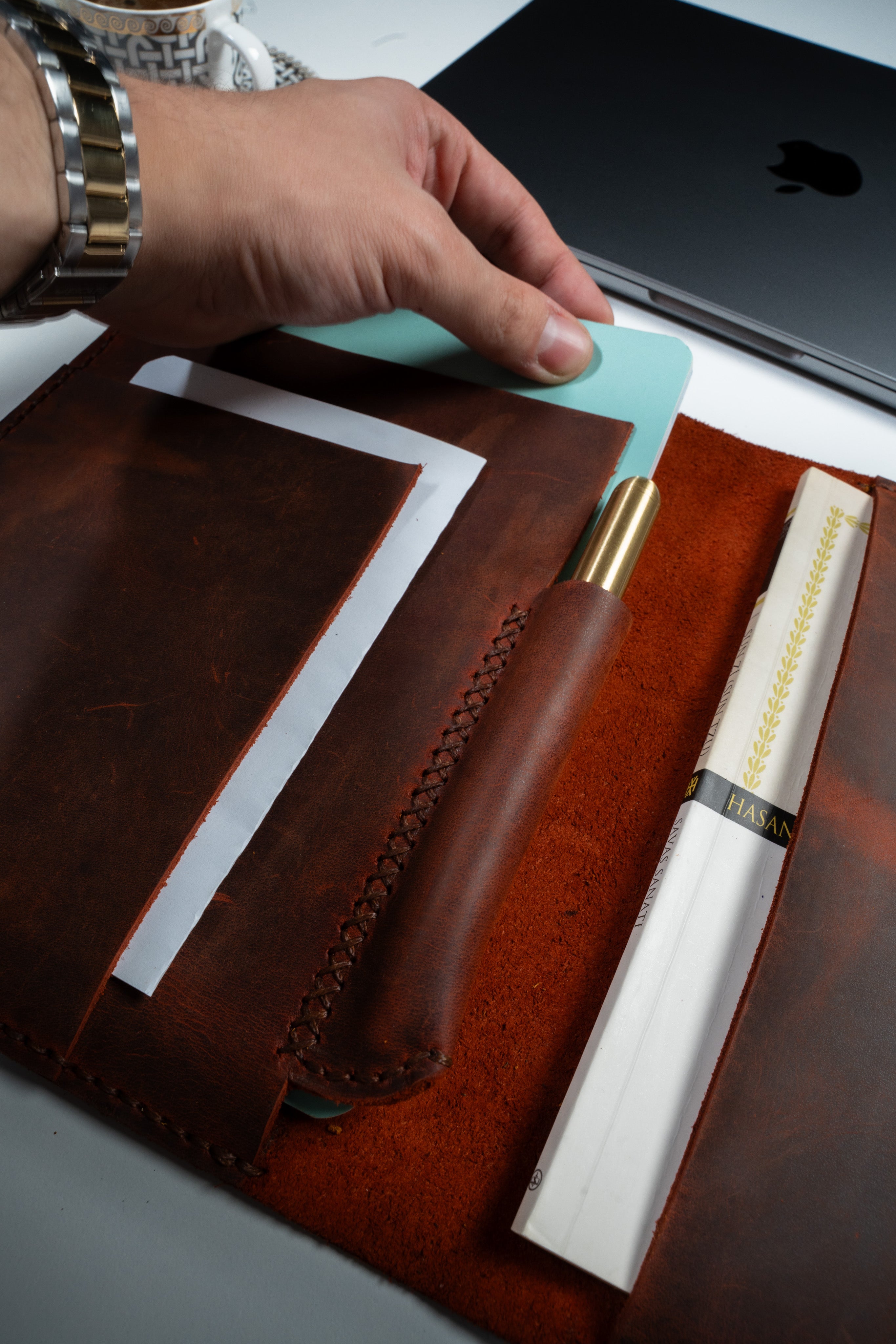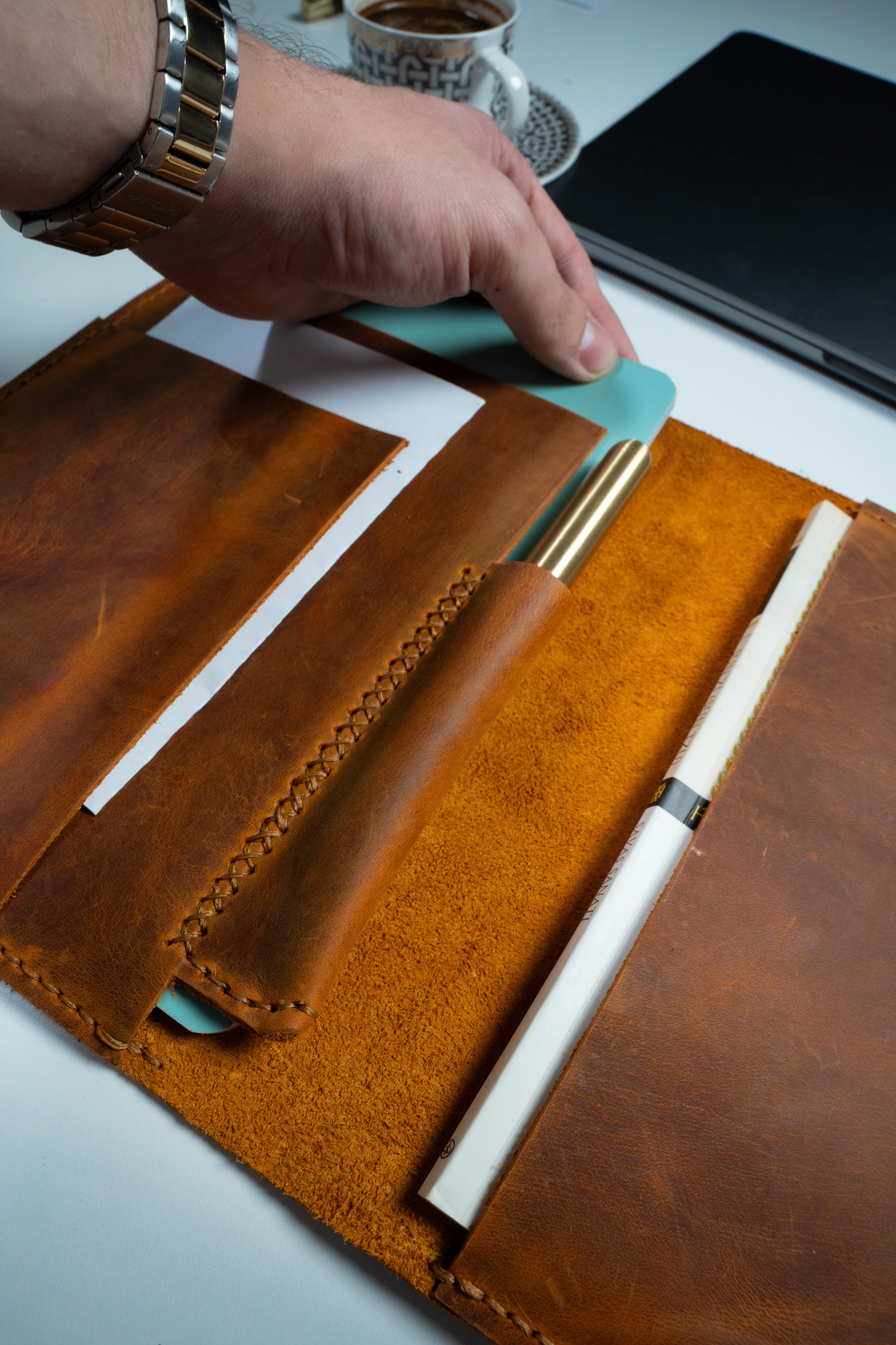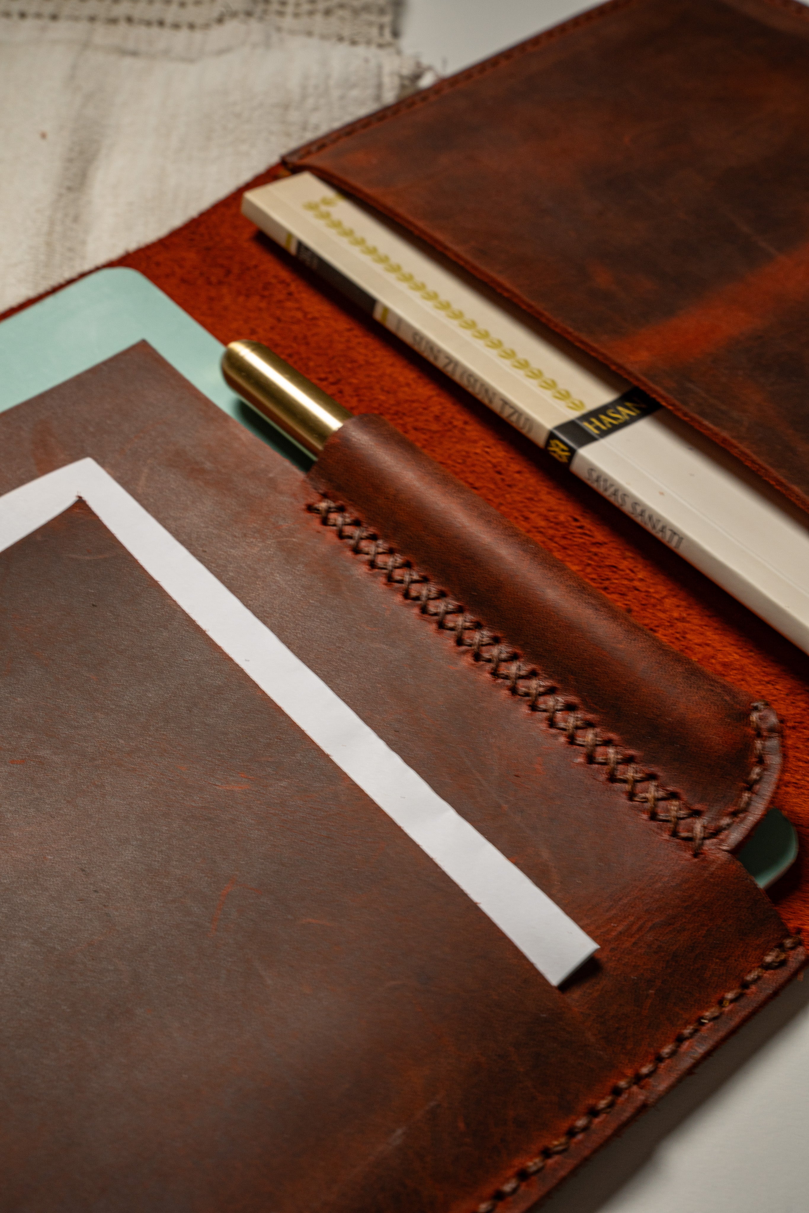 Tamamen el işçiliğiyle hazırlanan bu deri kılıf, zamanla kendi izini oluşturan doğal dokusu, yumuşak tutuşu ve fonksiyonel iç düzeniyle; toplantılarınızda, derslerinizde, yolculuklarınızda ve üretken olduğunuz her anın tamamlayıcısıdır.