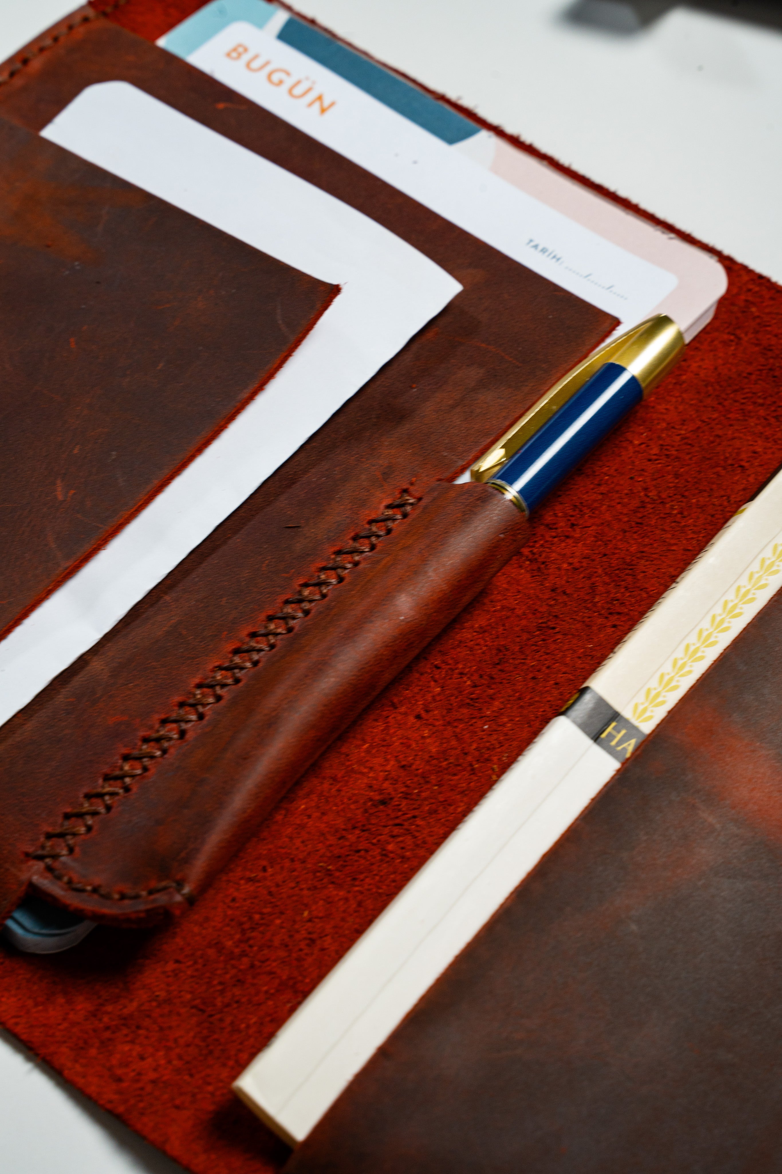 El Yapımı Deri Notebook Kılıfı – Kalem Bölmeli & Organizer Tasarım