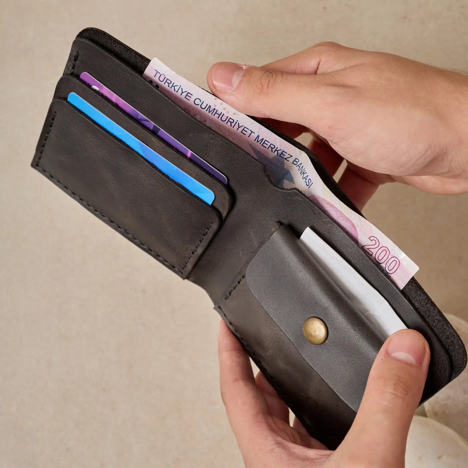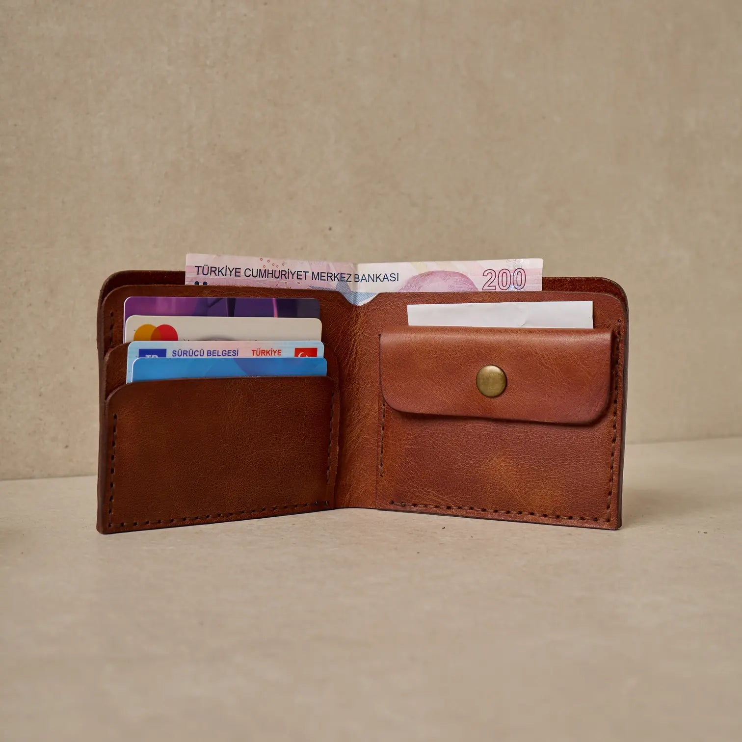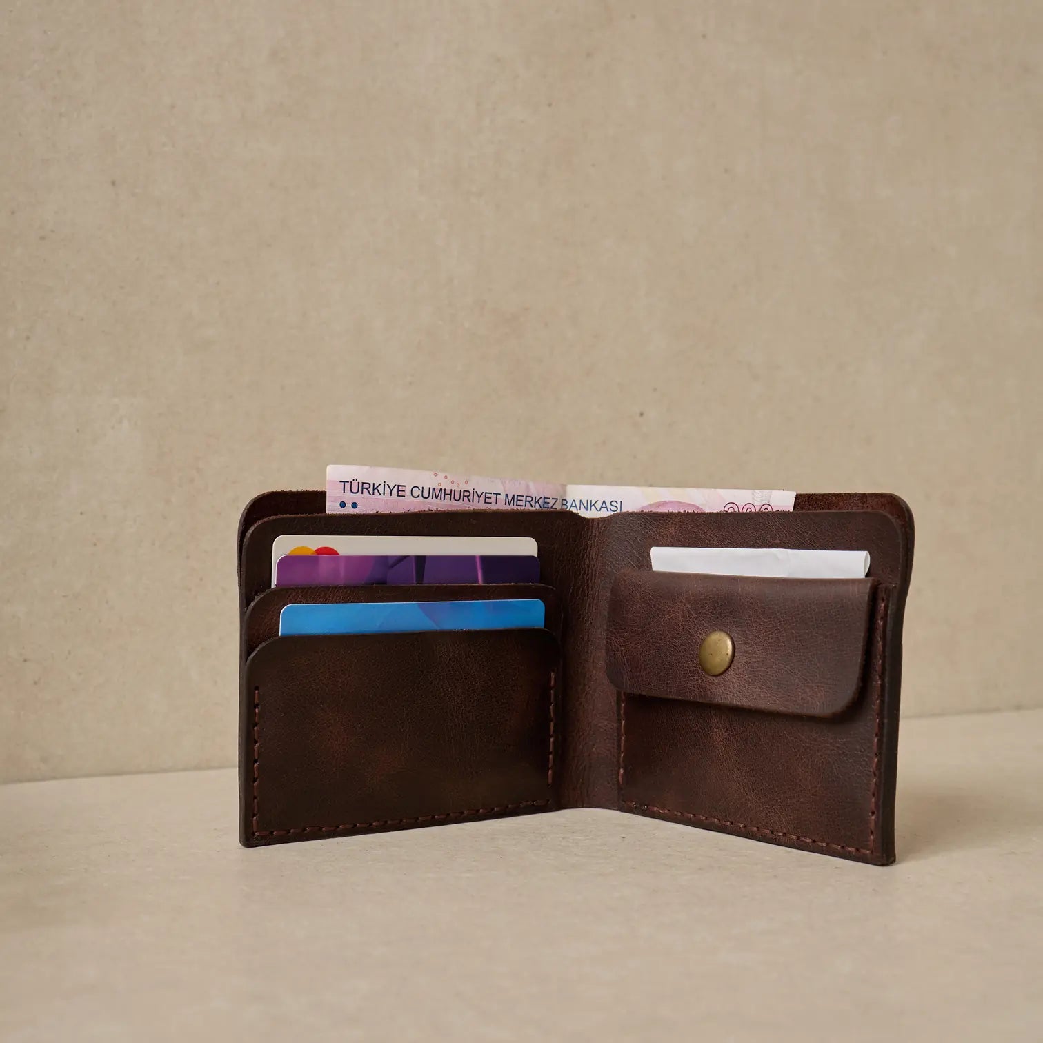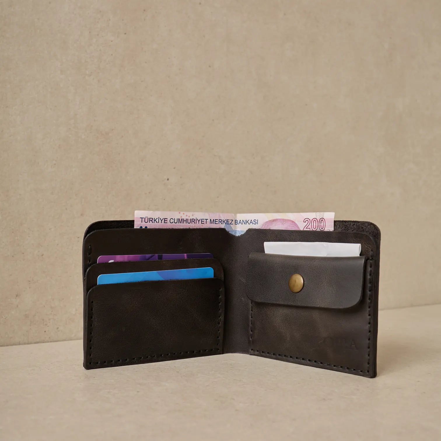 TUĞRA Model Cüzdanımız, Bozuk paralarınız veya başka koymak istedikleriniz için özel olarak tasarlanmış düğmeli cebiyle size rahatlık sağlıyor.