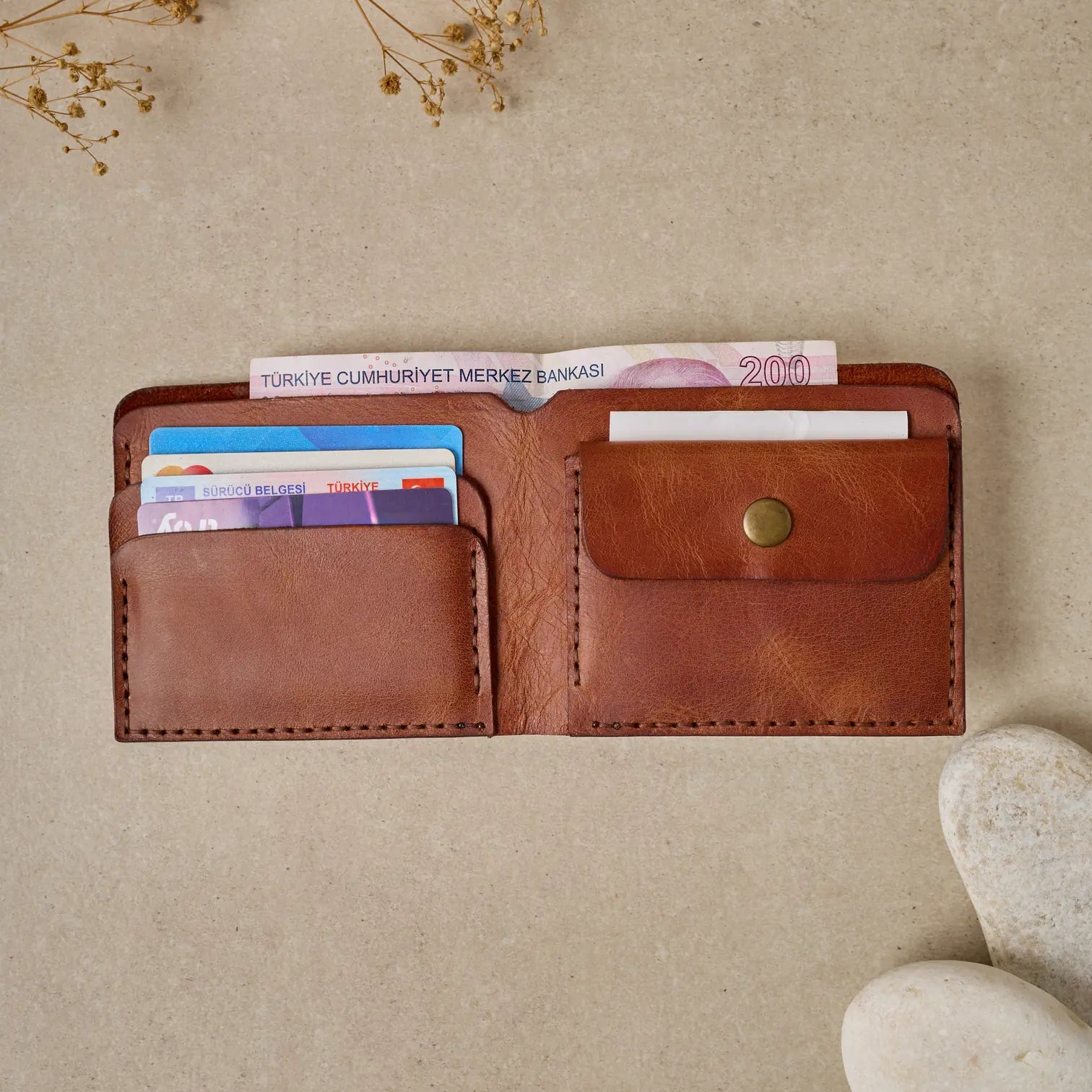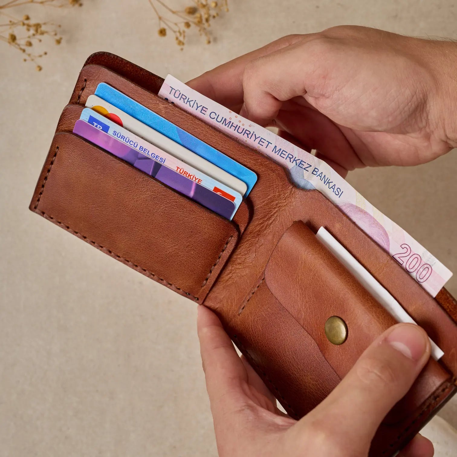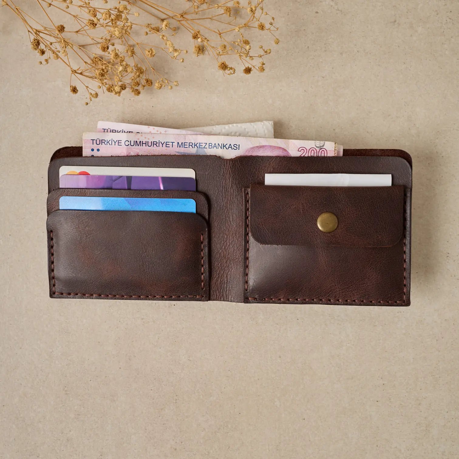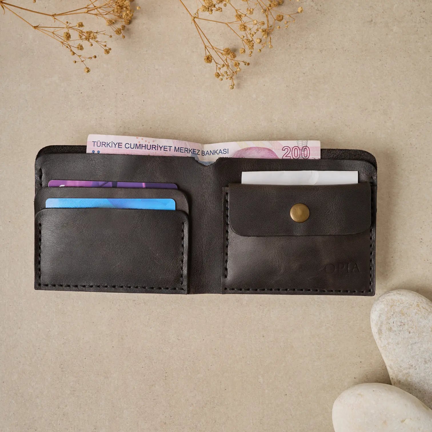 TUĞRA Model Cüzdanımız, Bozuk paralarınız veya başka koymak istedikleriniz için özel olarak tasarlanmış düğmeli cebiyle size rahatlık sağlıyor.